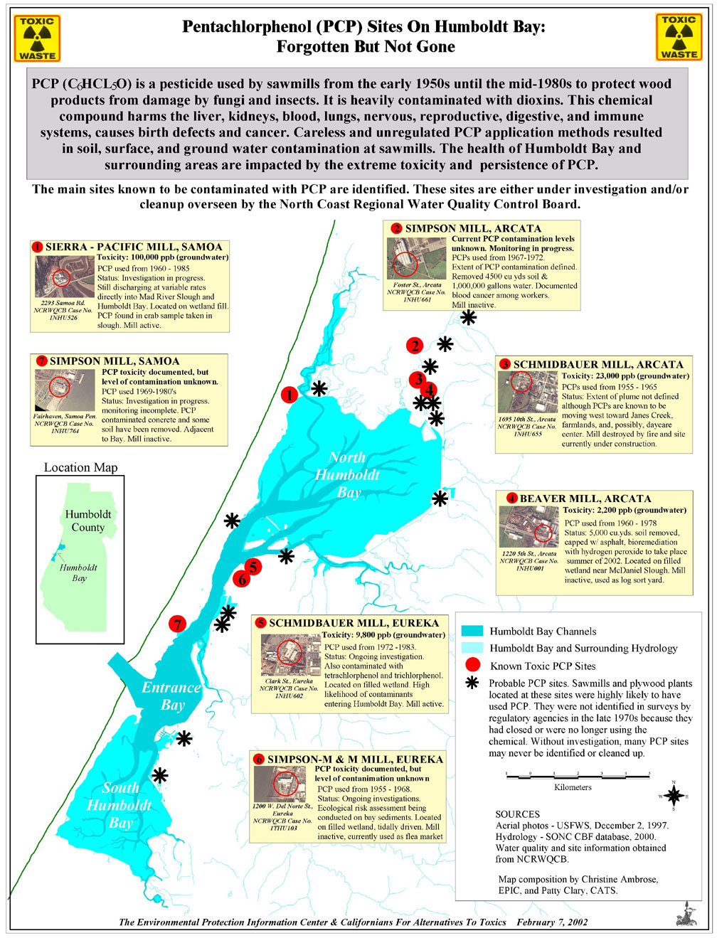 A few former and current sawmill sites located on the Humboldt Bay have been subject to regional water board oversight for penta and dioxin contamination. These include: Beaver Lumber Company; Schmidbauer Lumber Company, Arcata and Eureka; Sierra-Pacific Industry, Arcata; and Simpson Timber Company, Fairhaven and Arcata.